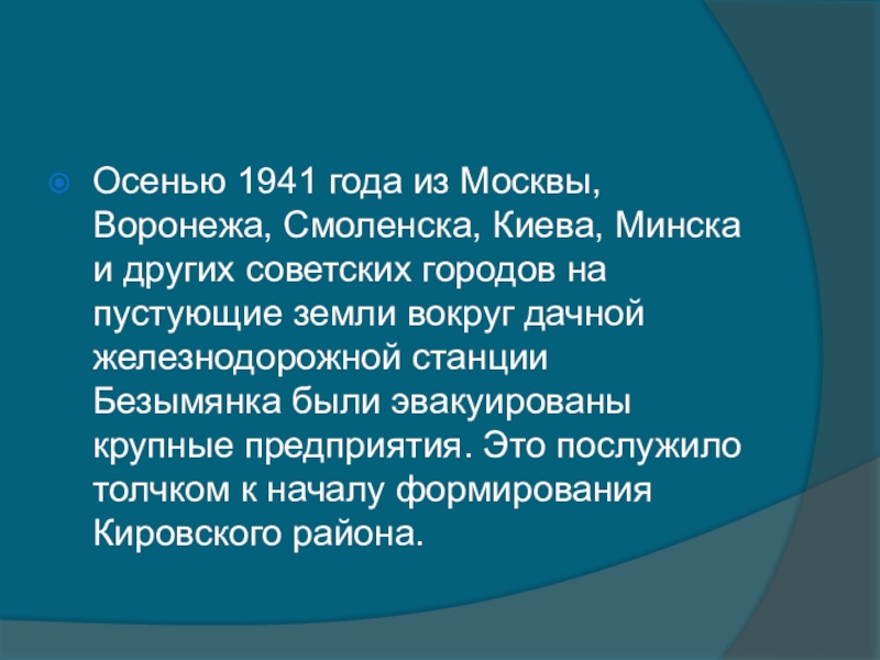 советских городов на пустующие земли вокруг дачной железнодорожной станции Безымянка были эвакуированы крупные предприятия. Это послужило толчком к началу формирования Кировского района.