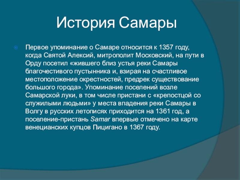 Самаре относится к 1357 году, когда Святой Алексий, митрополит Московский, на пути в Орду посетил «жившего близ устья реки Самары благочестивого пустынника и, взирая на счастливое местоположение окрестностей, предрек существование большого города». Упоминание поселений возле Самарской луки, в том числе пристани с «крепостцой со служилыми людьми» у места впадения реки Самары в Волгу в русских летописях приходится на 1361 год, а поселение-пристань Samar впервые отмечено на карте венецианских купцов Пицигано в 1367 году.