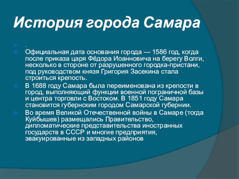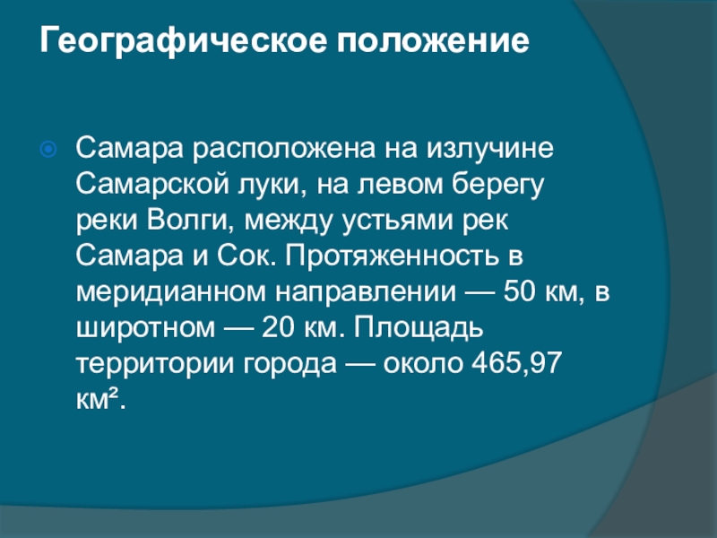 Самара - крупный город в России на левом возвышенном берегу реки Волга в излучине Самарской Луки, между устьями реки Самара и реки Сок, административный центр Самарской области