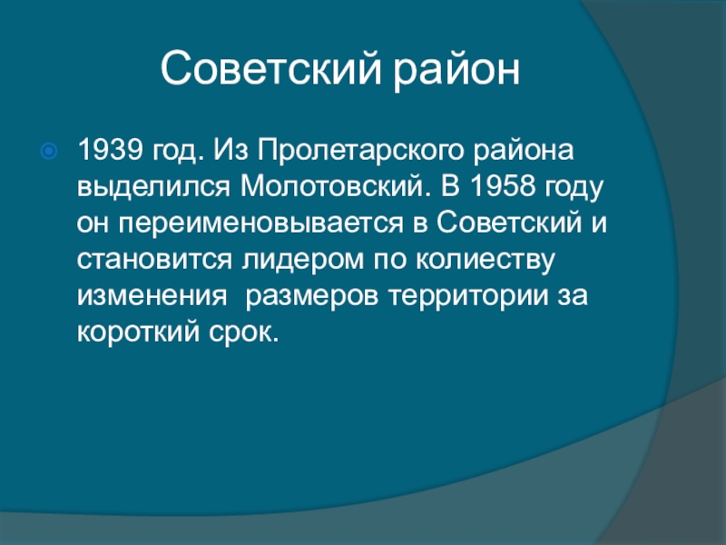 района выделился Молотовский. В 1958 году он переименовывается в Советский и становится лидером по колиеству изменения размеров территории за короткий срок.
