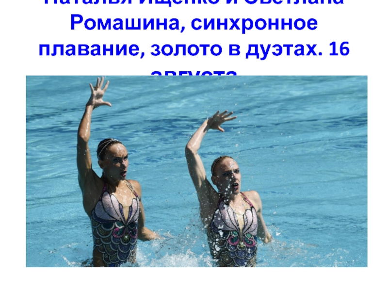Слайд 39Наталья Ищенко и Светлана Ромашина, синхронное плавание, золото в дуэтах. 16