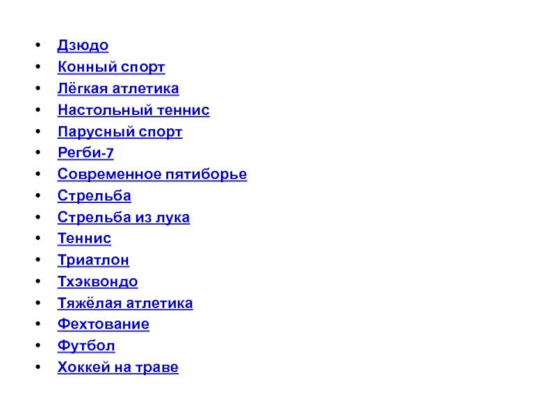 Дзюдо Конный спорт Лёгкая атлетика Настольный теннис Парусный спорт Регби-7 Современное пятиборье Стрельба Стрельба из лука Теннис Триатлон Тхэквондо Тяжёлая атлетика Фехтование Футбол Хоккей на траве
