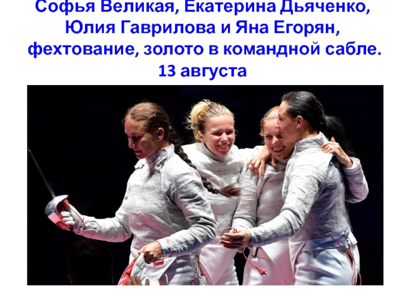 Софья Великая, Екатерина Дьяченко, Юлия Гаврилова и Яна Егорян, фехтование, золото в командной сабле. 13 августа