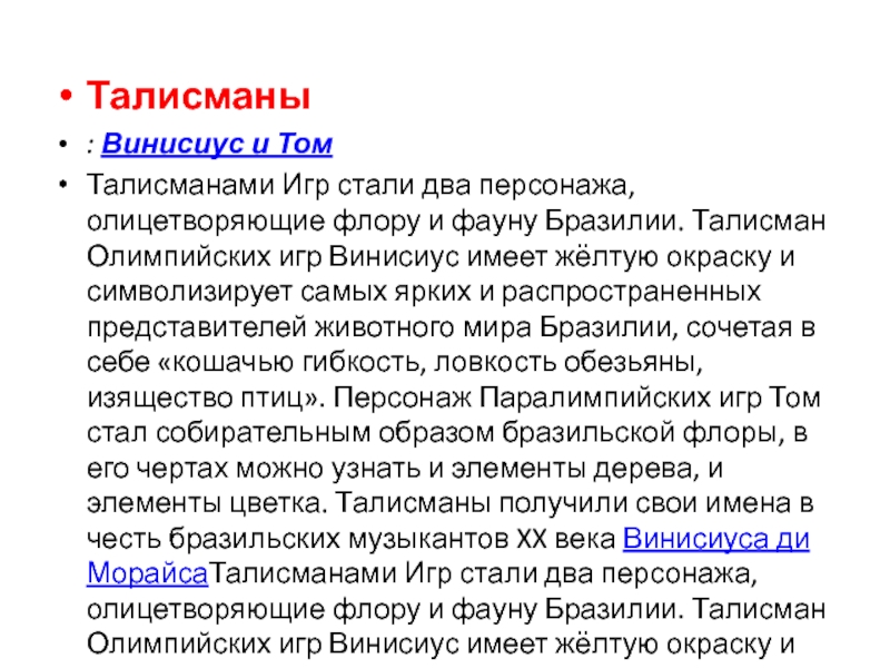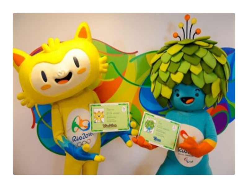 Бразилии. Талисман Олимпийских игр Винисиус имеет жёлтую окраску и символизирует самых ярких и распространенных представителей животного мира Бразилии, сочетая в себе «кошачью гибкость, ловкость обезьяны, изящество птиц». Персонаж Паралимпийских игр Том стал собирательным образом бразильской флоры, в его чертах можно узнать и элементы дерева, и элементы цветка. Талисманы получили свои имена в честь бразильских музыкантов XX века Винисиуса ди МорайсаТалисманами Игр стали два персонажа, олицетворяющие флору и фауну Бразилии. Талисман Олимпийских игр Винисиус имеет жёлтую окраску и символизирует самых ярких и распространенных представителей животного мира Бразилии, сочетая в себе «кошачью гибкость, ловкость обезьяны, изящество птиц». Персонаж Паралимпийских игр Том стал собирательным образом бразильской флоры, в его чертах можно узнать и элементы дерева, и элементы цветка. Талисманы получили свои имена в честь бразильских музыкантов XX века Винисиуса ди Морайса (1913—1980) и Тома Жобима (1927—1994)