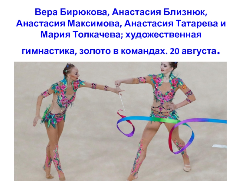 Вера Бирюкова, Анастасия Близнюк, Анастасия Максимова, Анастасия Татарева и Мария Толкачева; художественная гимнастика, золото в командах. 20