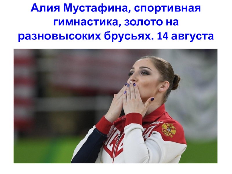 Слайд 36Алия Мустафина, спортивная гимнастика, золото на разновысоких брусьях. 14 августа
