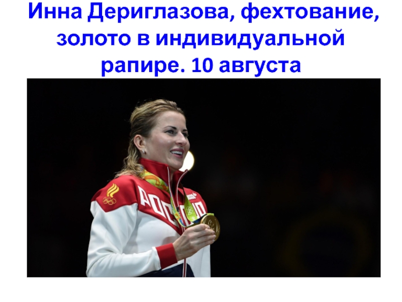 Слайд 31Инна Дериглазова, фехтование, золото в индивидуальной рапире. 10 августа