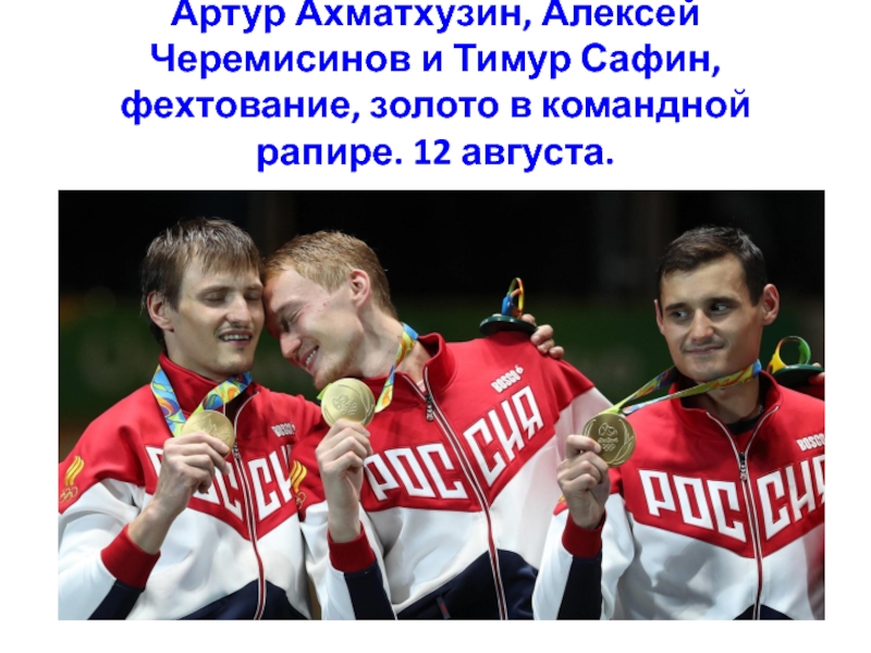 Слайд 32Артур Ахматхузин, Алексей Черемисинов и Тимур Сафин, фехтование, золото в командной