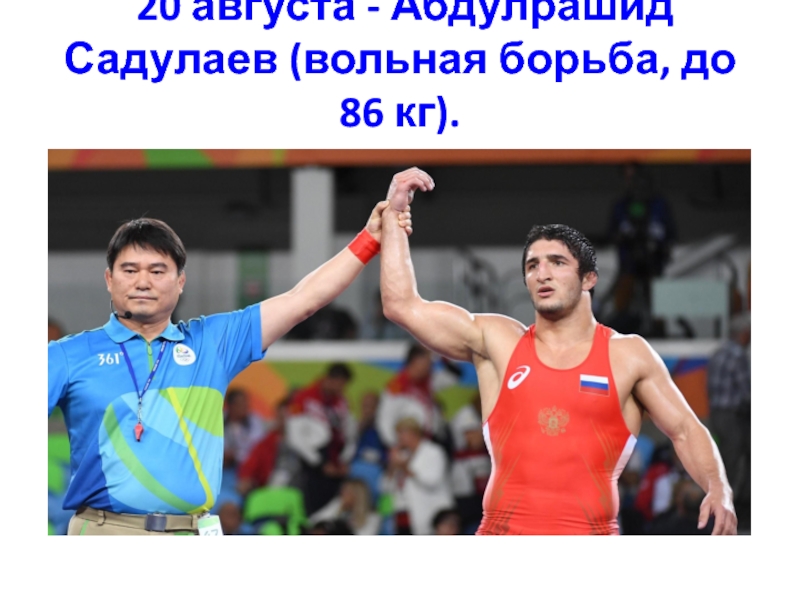 Слайд 43 20 августа - Абдулрашид Садулаев (вольная борьба, до 86 кг).