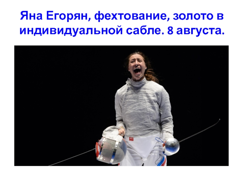 Слайд 29Яна Егорян, фехтование, золото в индивидуальной сабле. 8 августа.