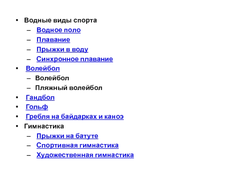 Водные виды спорта Водное поло Плавание Прыжки в воду Синхронное плавание ВолейболВолейболПляжный волейбол Гандбол Гольф Гребля на байдарках и каноэГимнастика Прыжки на батуте Спортивная гимнастика Художественная гимнастика