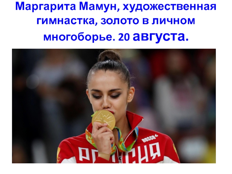 Слайд 47Маргарита Мамун, художественная гимнастка, золото в личном многоборье. 20 августа.