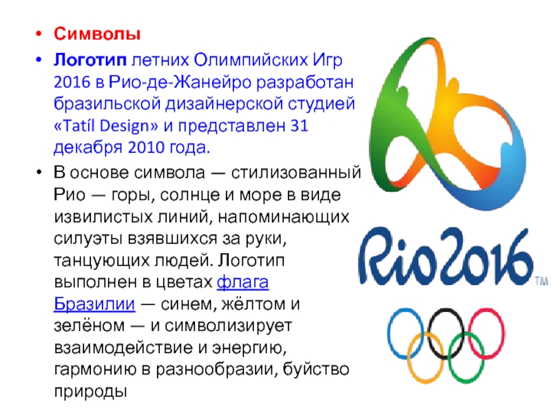 Символы Логотип летних Олимпийских Игр 2016 в Рио-де-Жанейро разработан бразильской дизайнерской студией «Tatíl Design» и представлен 31