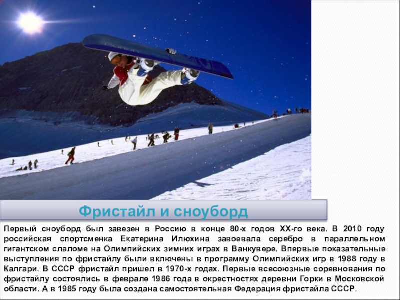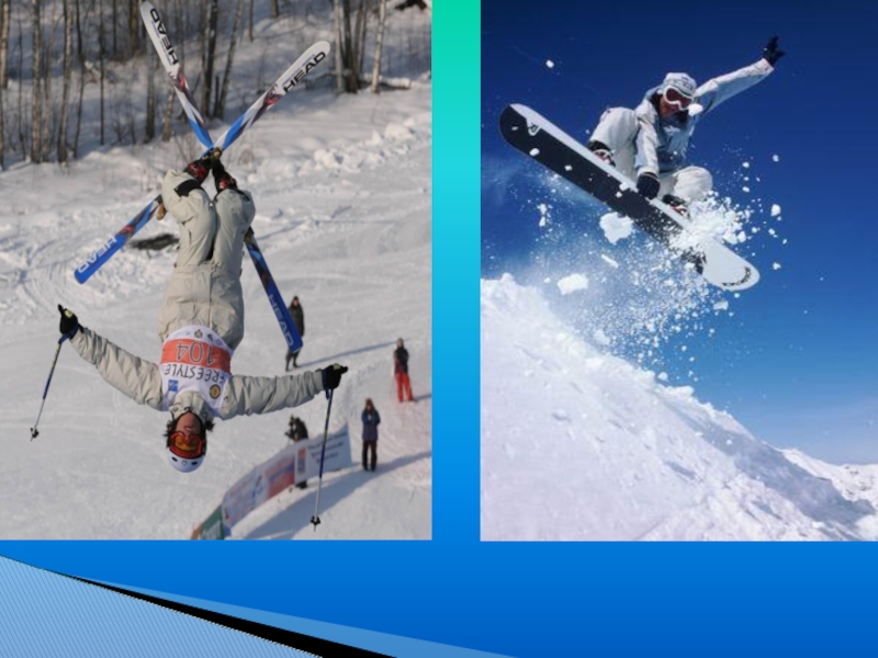 Лыжный спорт:горные лыжи, лыжные гонки, лыжное двоеборье, прыжки на лыжах с трамплина, фристайл и сноуборд.