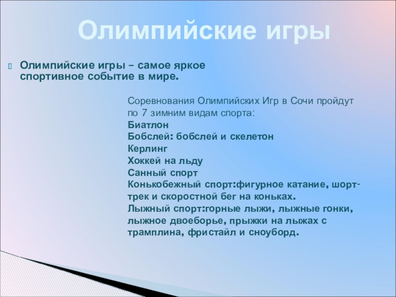Соревнования Олимпийских Игр в Сочи пройдут по 7 зимним видам спорта: