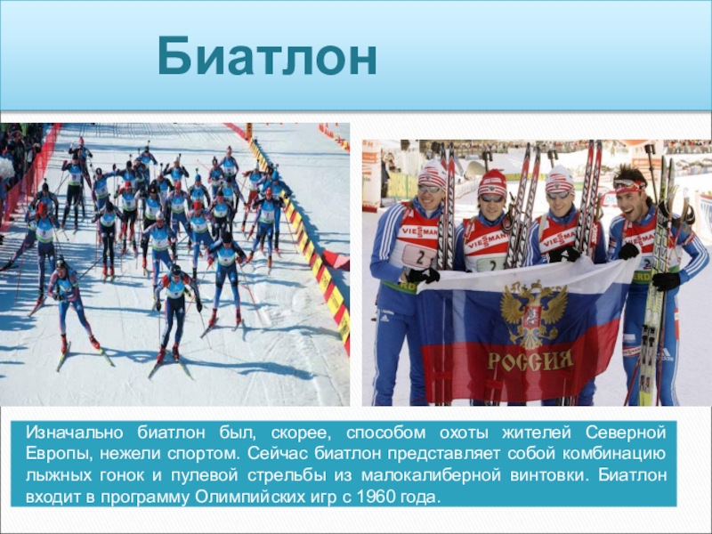 Изначально биатлон был, скорее, способом охоты жителей Северной Европы, нежели спортом. Сейчас биатлон представляет собой комбинацию лыжных гонок и пулевой стрельбы из малокалиберной винтовки. Биатлон входит в программу Олимпийских игр с 1960 года.