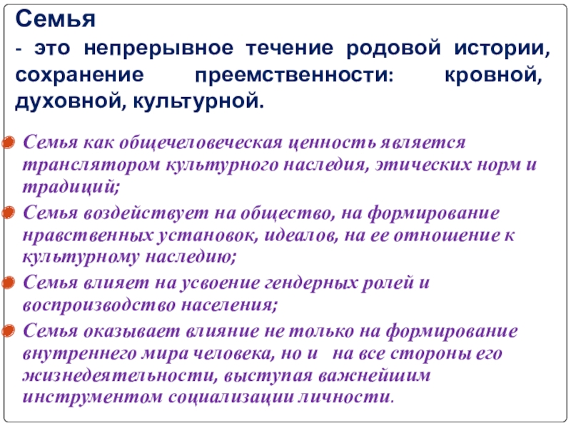 Семья как общечеловеческая ценность является транслятором культурного наследия, этических норм и традиций;