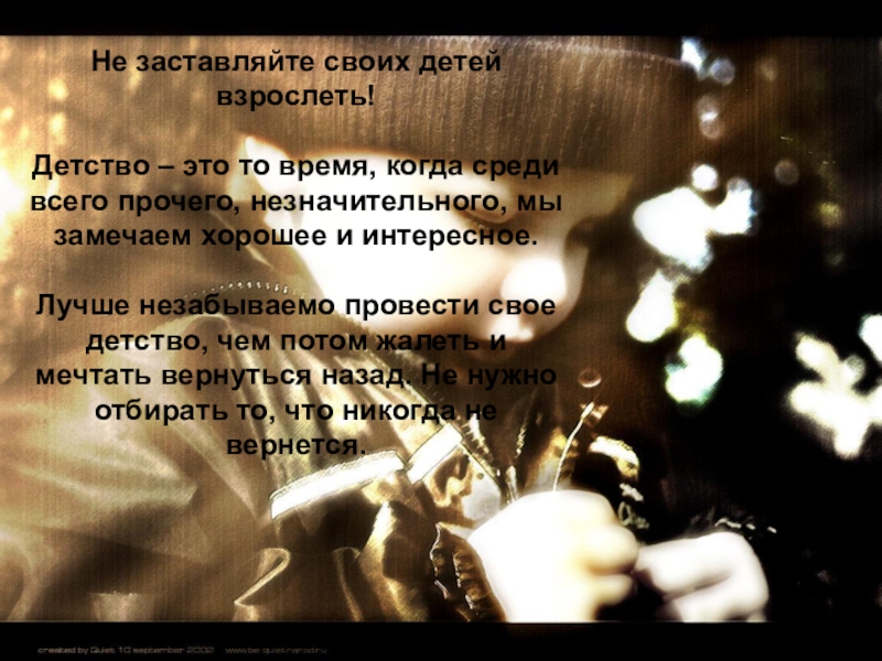 Лучше незабываемо провести свое детство, чем потом жалеть и мечтать вернуться назад. Не нужно отбирать то, что никогда не вернется.