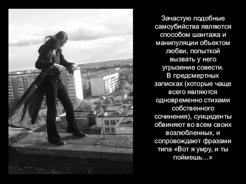 Слайд 7Зачастую подобные самоубийства являются способом шантажа и манипуляции объектом любви, попыткой