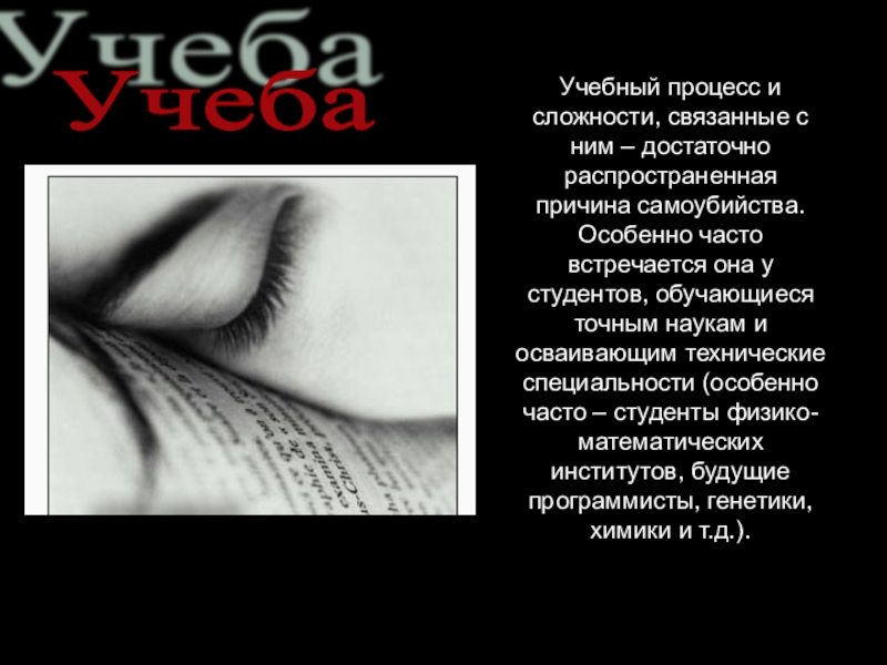 причина самоубийства. Особенно часто встречается она у студентов, обучающиеся точным наукам и осваивающим технические специальности (особенно часто – студенты физико-математических институтов, будущие программисты, генетики, химики и т.д.).