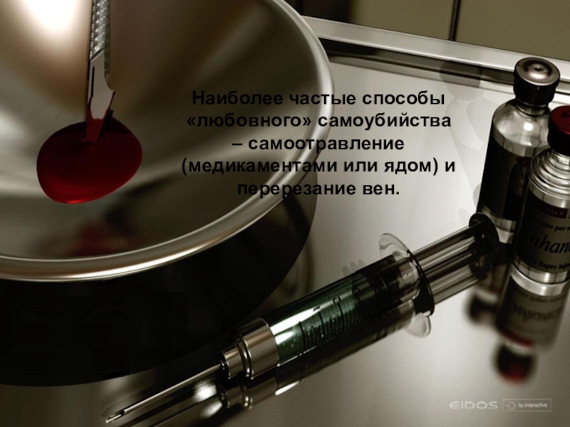 Слайд 5Наиболее частые способы «любовного» самоубийства – самоотравление (медикаментами или ядом) и