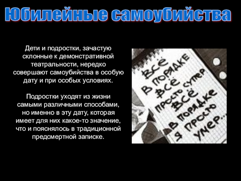 Подростки уходят из жизни самыми различными способами, но именно в эту дату, которая имеет для них какое-то значение, что и пояснялось в традиционной предсмертной записке.