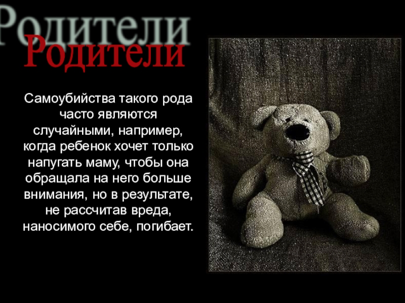 Слайд 11Самоубийства такого рода часто являются случайными, например, когда ребенок хочет только