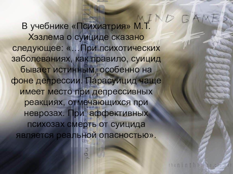 В учебнике «Психиатрия» М.Т. Хэзлема о суициде сказано следующее: «…При психотических