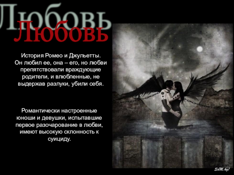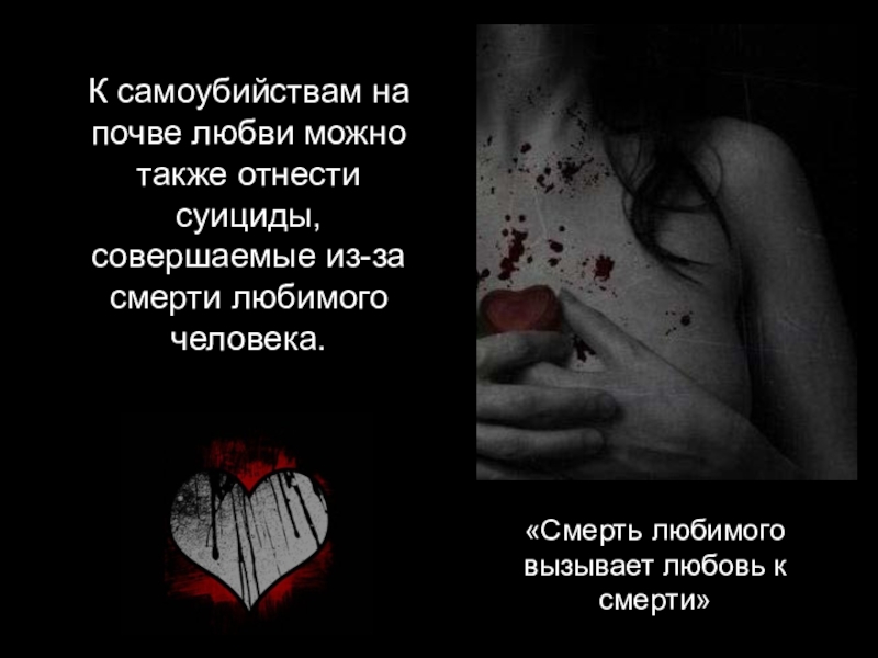 Слайд 8К самоубийствам на почве любви можно также отнести суициды, совершаемые из-за