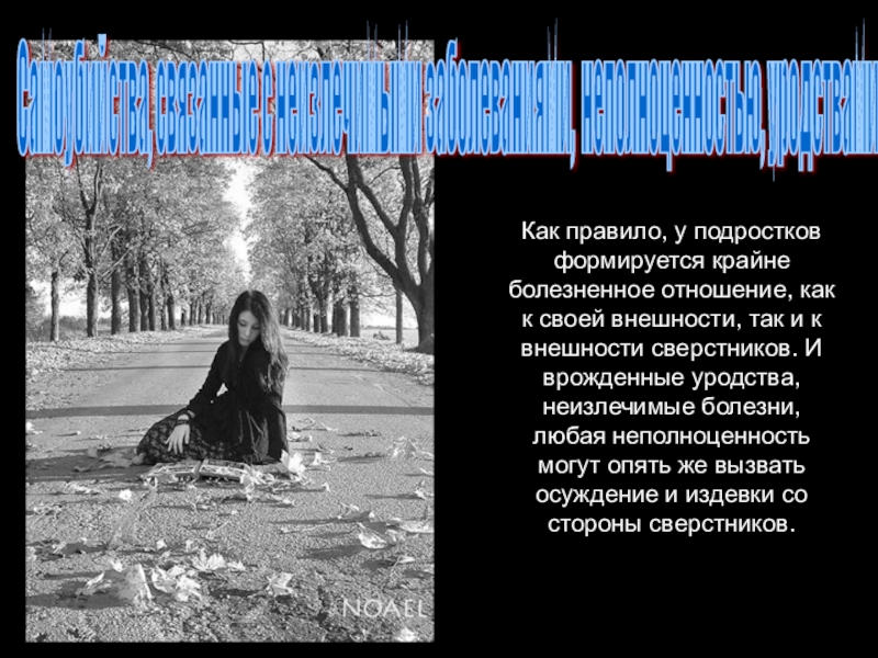 внешности, так и к внешности сверстников. И врожденные уродства, неизлечимые болезни, любая неполноценность могут опять же вызвать осуждение и издевки со стороны сверстников.
