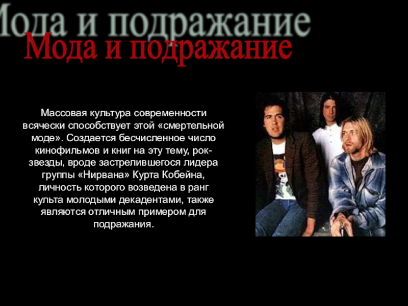 Создается бесчисленное число кинофильмов и книг на эту тему, рок-звезды, вроде застрелившегося лидера группы «Нирвана» Курта Кобейна, личность которого возведена в ранг культа молодыми декадентами, также являются отличным примером для подражания.