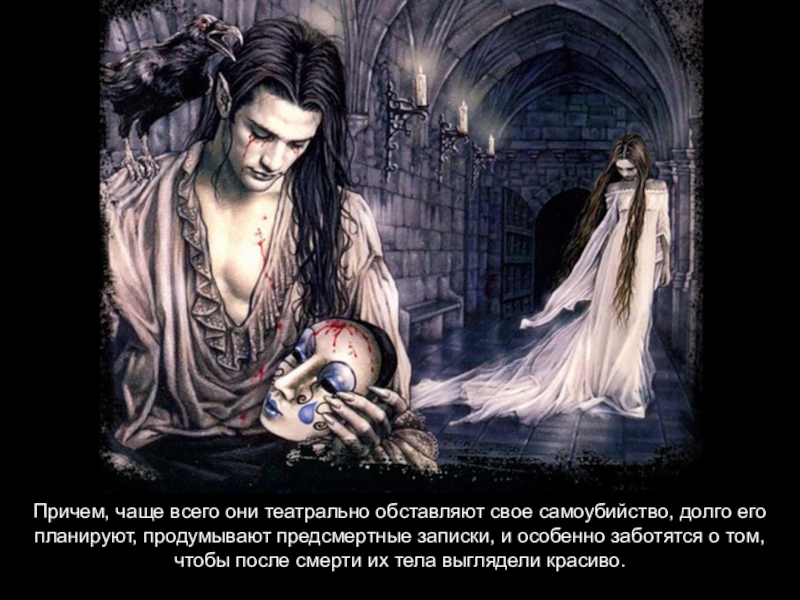 Слайд 4Причем, чаще всего они театрально обставляют свое самоубийство, долго его планируют,