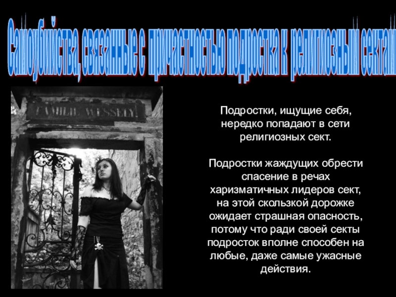 Слайд 44Самоубийства, связанные с причастностью подростка к религиозным сектам