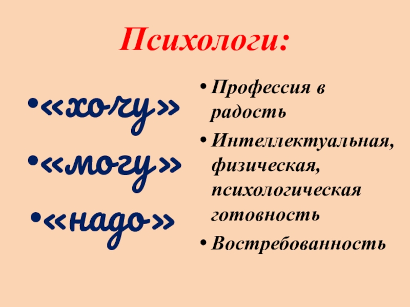 Психологи:«хочу»«могу»«надо»Профессия в радостьИнтеллектуальная, физическая, психологическая готовностьВостребованность