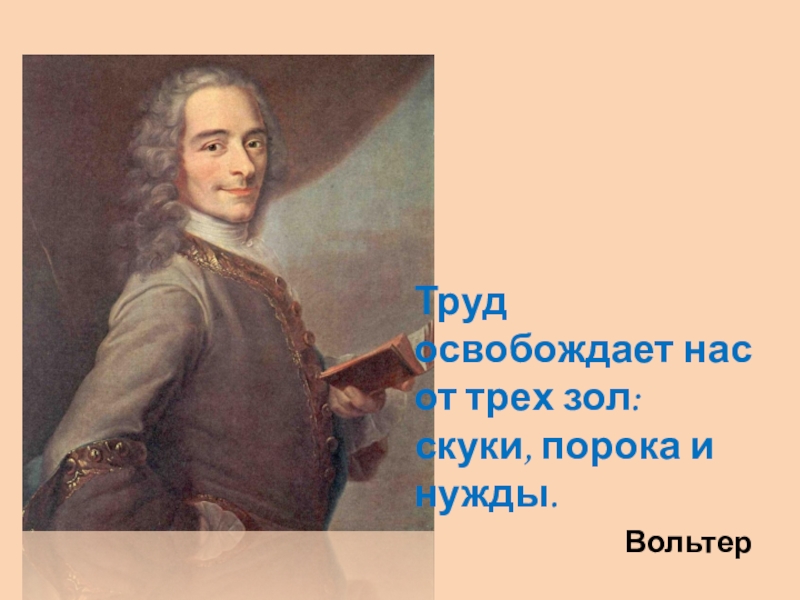 Труд освобождает нас от трех зол: скуки, порока и нужды.Вольтер