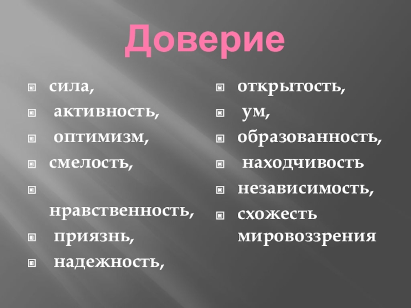 Доверие сила, активность, оптимизм, смелость, нравственность, приязнь, надежность,открытость, ум, образованность, находчивостьнезависимость,схожесть мировоззрения