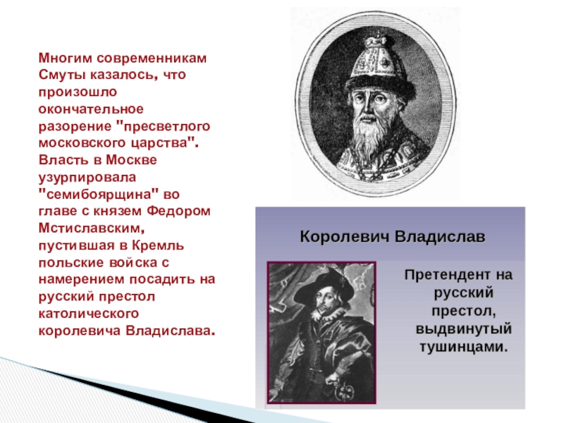 Власть в Москве узурпировала "семибоярщина" во главе с князем Федором Мстиславским, пустившая в Кремль польские войска с намерением посадить на русский престол католического королевича Владислава.