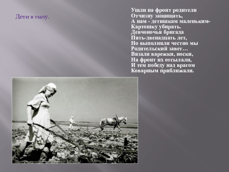 детишкам маленьким- Картошку убирать. Девчоночья бригада Пять-двенадцать лет, Но выполняли честно мы Родительский завет… Вязали варежки, носки, На фронт их отсылали, И тем победу над врагом Коварным приближали.