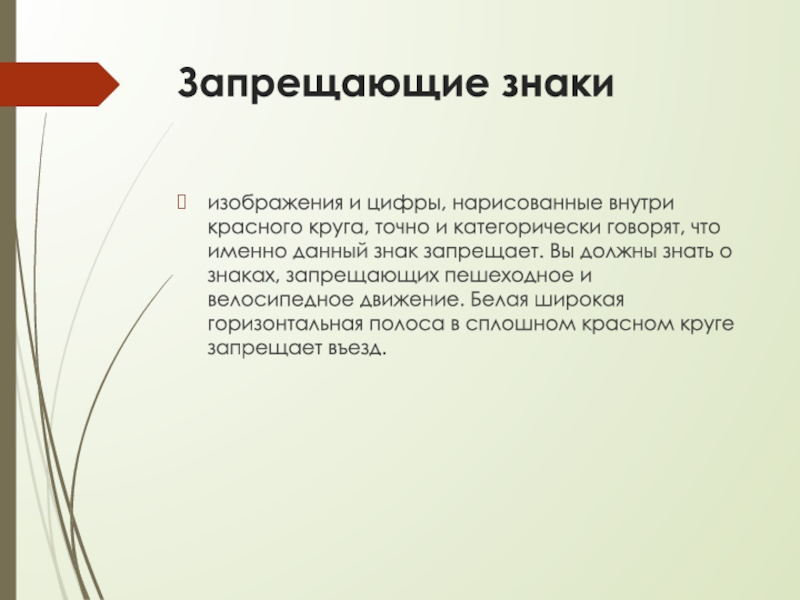Запрещающие знакиизображения и цифры, нарисованные внутри красного круга, точно и категорически говорят, что именно данный знак запрещает.