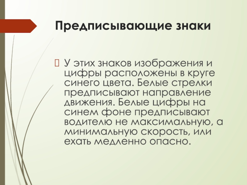 цвета. Белые стрелки предписывают направление движения. Белые цифры на синем фоне предписывают водителю не максимальную, а минимальную скорость, или ехать медленно опасно.