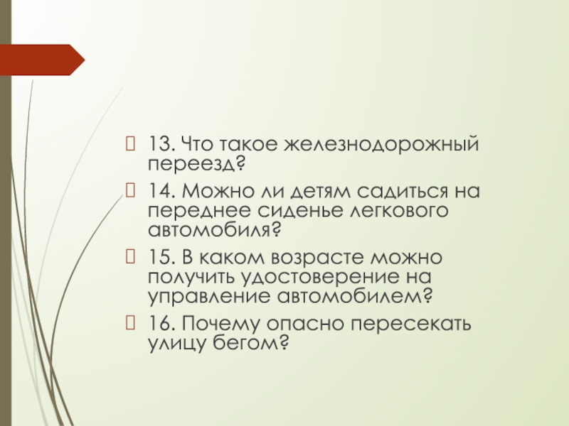 13. Что такое железнодорожный переезд? 14. Можно ли детям садиться на переднее сиденье легкового автомобиля? 15. В