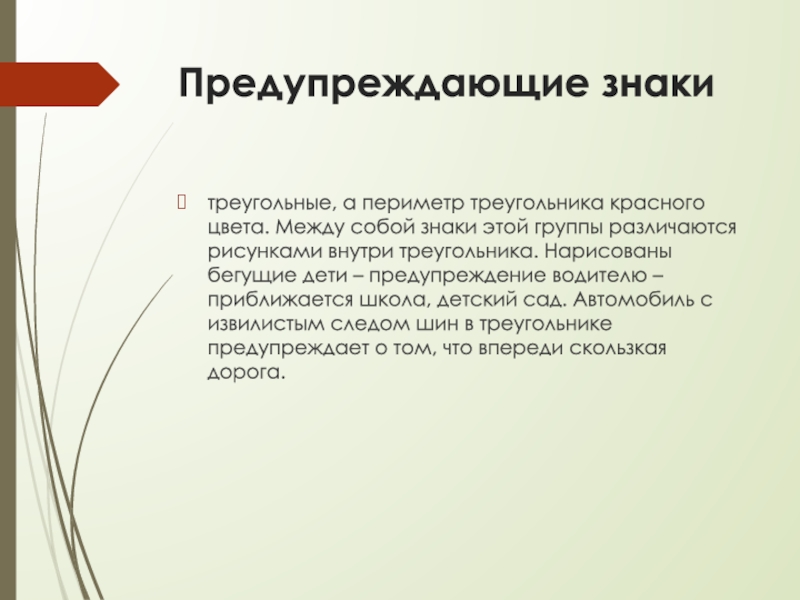 этой группы различаются рисунками внутри треугольника. Нарисованы бегущие дети – предупреждение водителю – приближается школа, детский сад. Автомобиль с извилистым следом шин в треугольнике предупреждает о том, что впереди скользкая дорога.