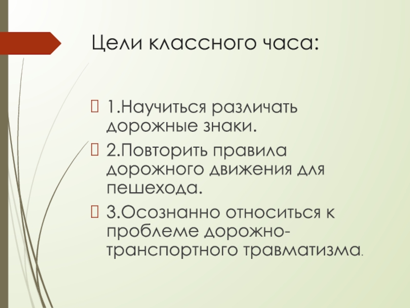 Цели классного часа:1.Научиться различать дорожные знаки.2.Повторить правила дорожного движения для пешехода.3.Осознанно относиться к проблеме дорожно-транспортного травматизма.