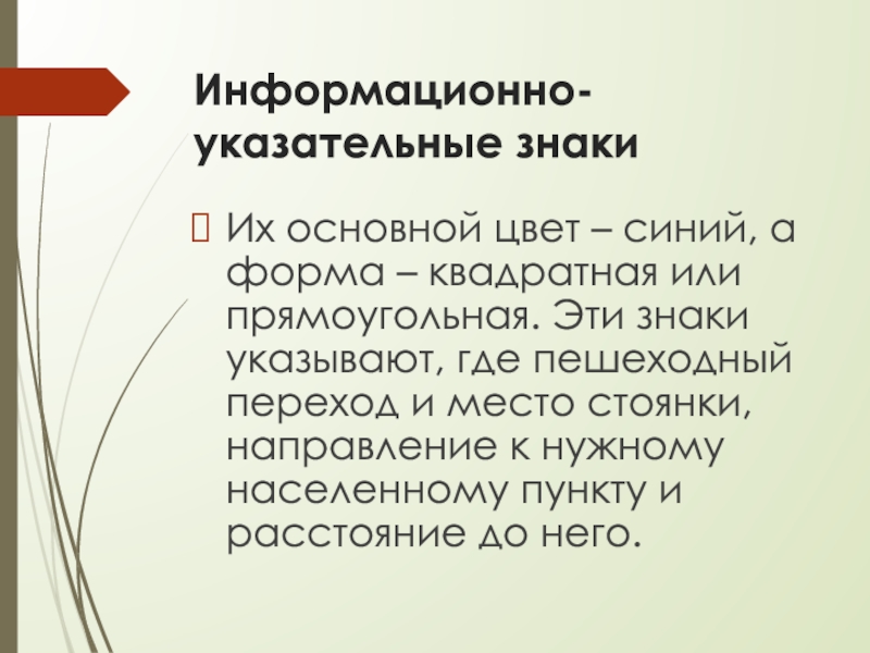 Информационно-указательные знакиИх основной цвет – синий, а форма – квадратная или прямоугольная. Эти знаки указывают, где пешеходный