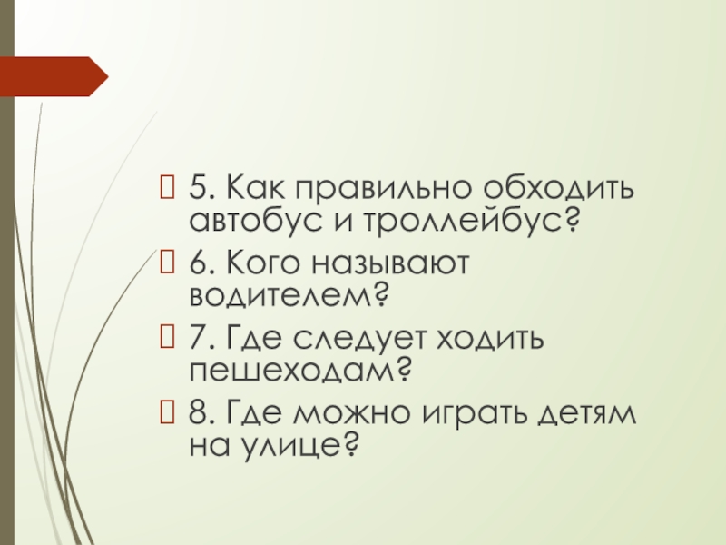 5. Как правильно обходить автобус и троллейбус? 6. Кого называют водителем? 7. Где следует ходить пешеходам? 8.