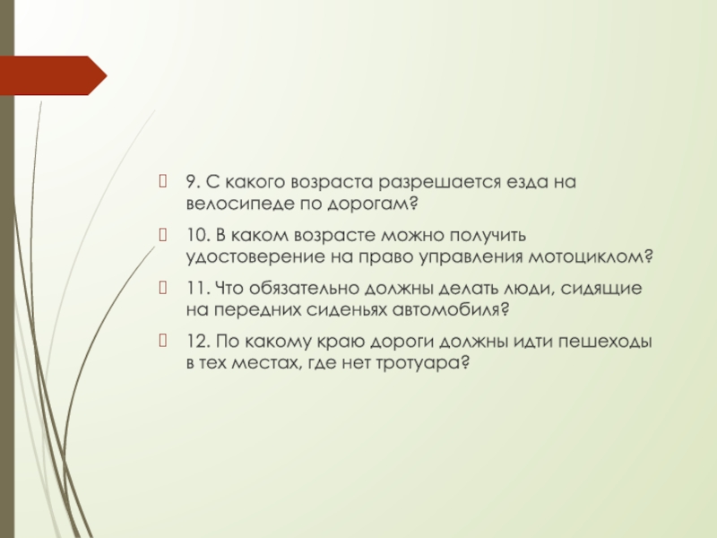 9. С какого возраста разрешается езда на велосипеде по дорогам? 10. В каком возрасте можно получить удостоверение