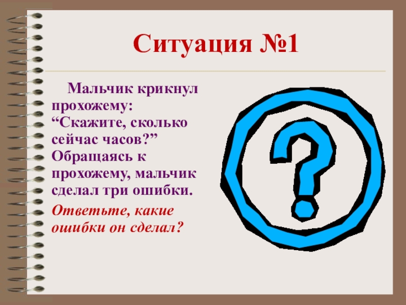 Ситуация №1  Мальчик крикнул прохожему: “Скажите, сколько сейчас часов?” Обращаясь к прохожему, мальчик сделал три ошибки.Ответьте,