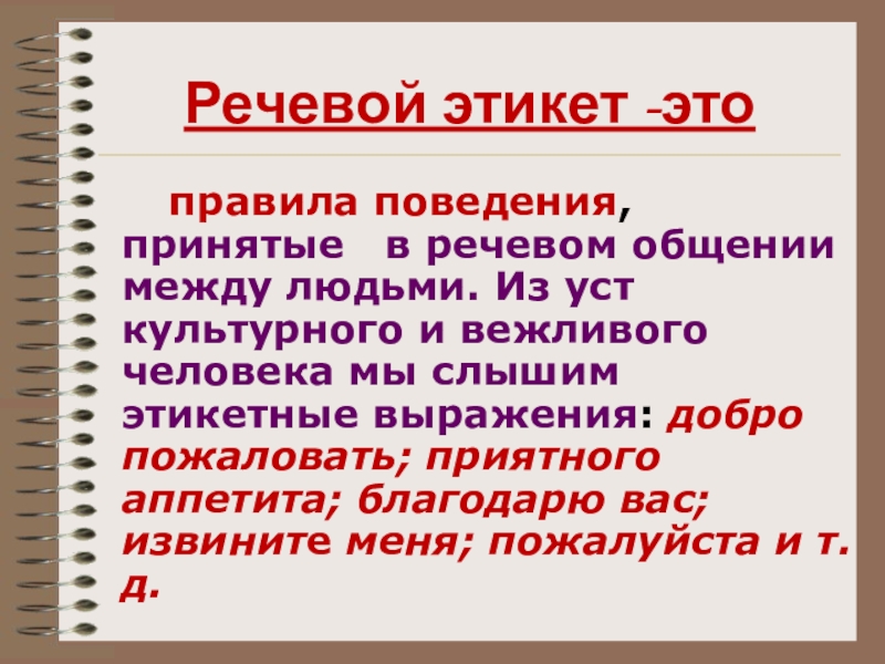 общении между людьми. Из уст культурного и вежливого человека мы слышим этикетные выражения: добро пожаловать; приятного аппетита; благодарю вас; извините меня; пожалуйста и т.д.