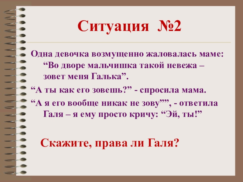 Ситуация №2Одна девочка возмущенно жаловалась маме: “Во дворе мальчишка такой невежа – зовет меня Галька”.“А ты как