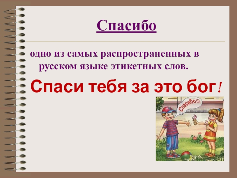 Спасибоодно из самых распространенных в русском языке этикетных слов. Спаси тебя за это бог!